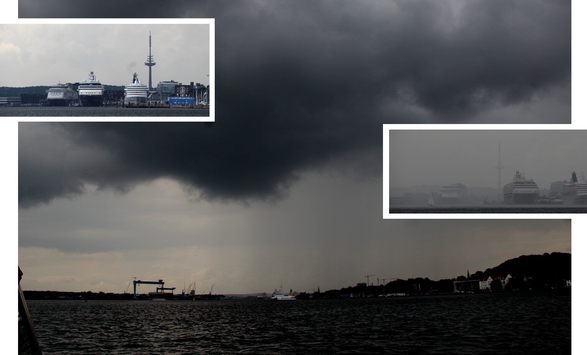 Auf dem Weg dorthin schwarze, schwere Wolken und kräftige Regenschauer. Schiffe, die man gerade noch sehen konnte, sind binnen Sekunden nicht mehr zu sehen. Die Beleuchtung wird eingeschaltet.