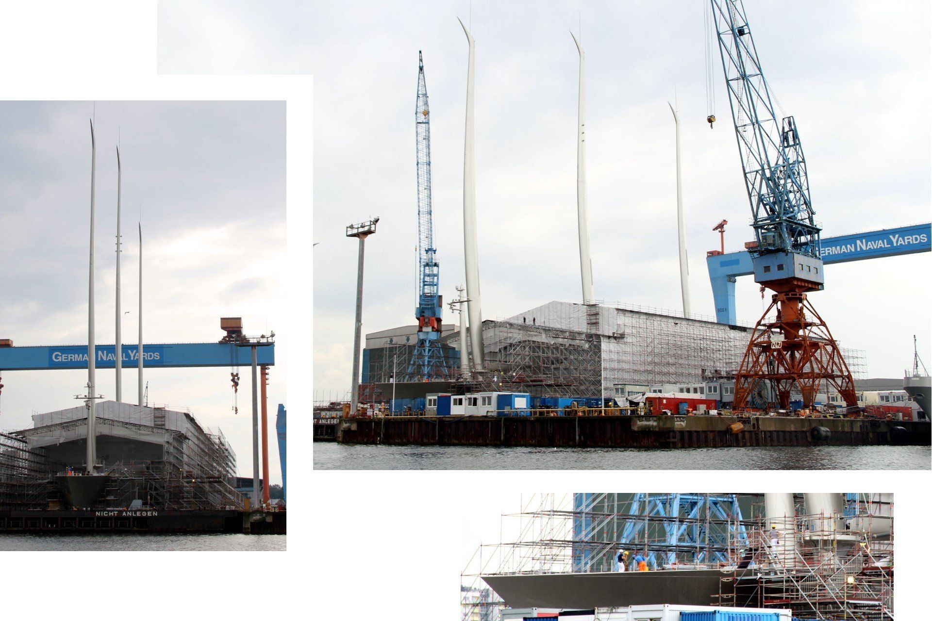 In der Zeitung lesen wir von der größten, im Bau befindlichen Segelyacht der Welt, in Kiel. Sie ist 140 m lang und 117 m hoch und trägt den Namen "A". In Auftrag gegeben wurde sie vom russischen Multi-Milliadär Andrey Melnichenko. Die genauen Kosten sind geheim. Es soll sich allerdings um einen hohen, dreistelligen Millionenbetrag handeln.