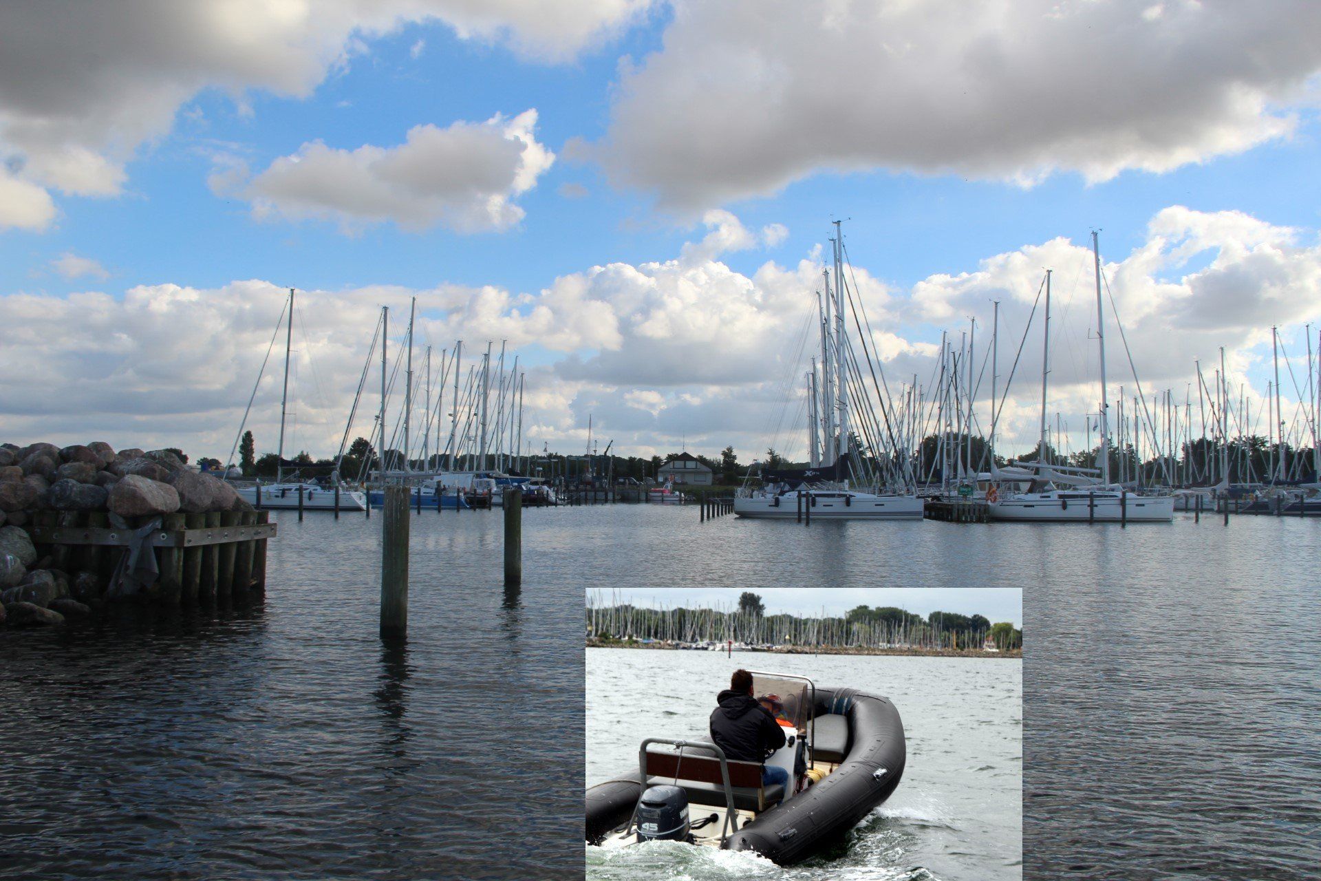Gerade als wir in den Hafen Gelting Mole einlaufen, kommt uns ein schwarzes Schlauchboot entgegen. Im Begegnungsverkehr grüßen wir uns gegenseitig wie es sich gehört.