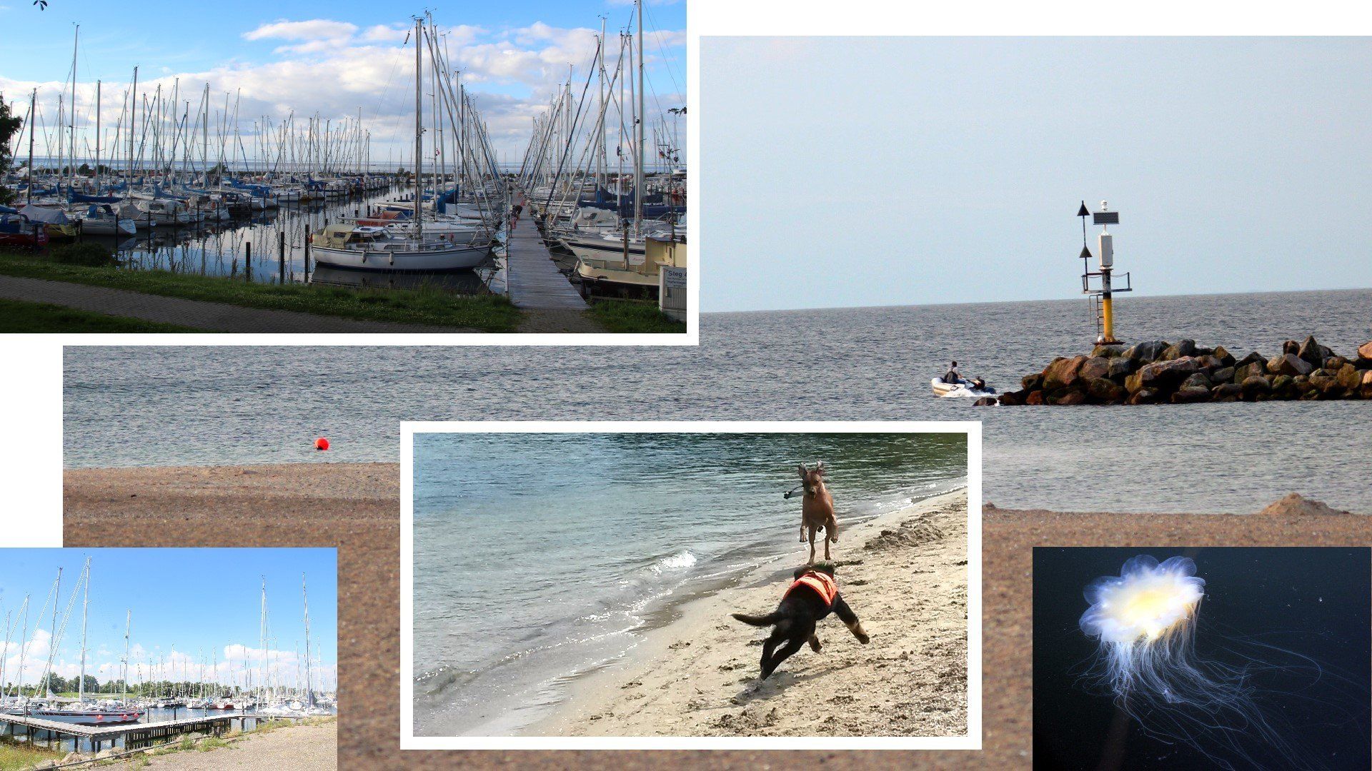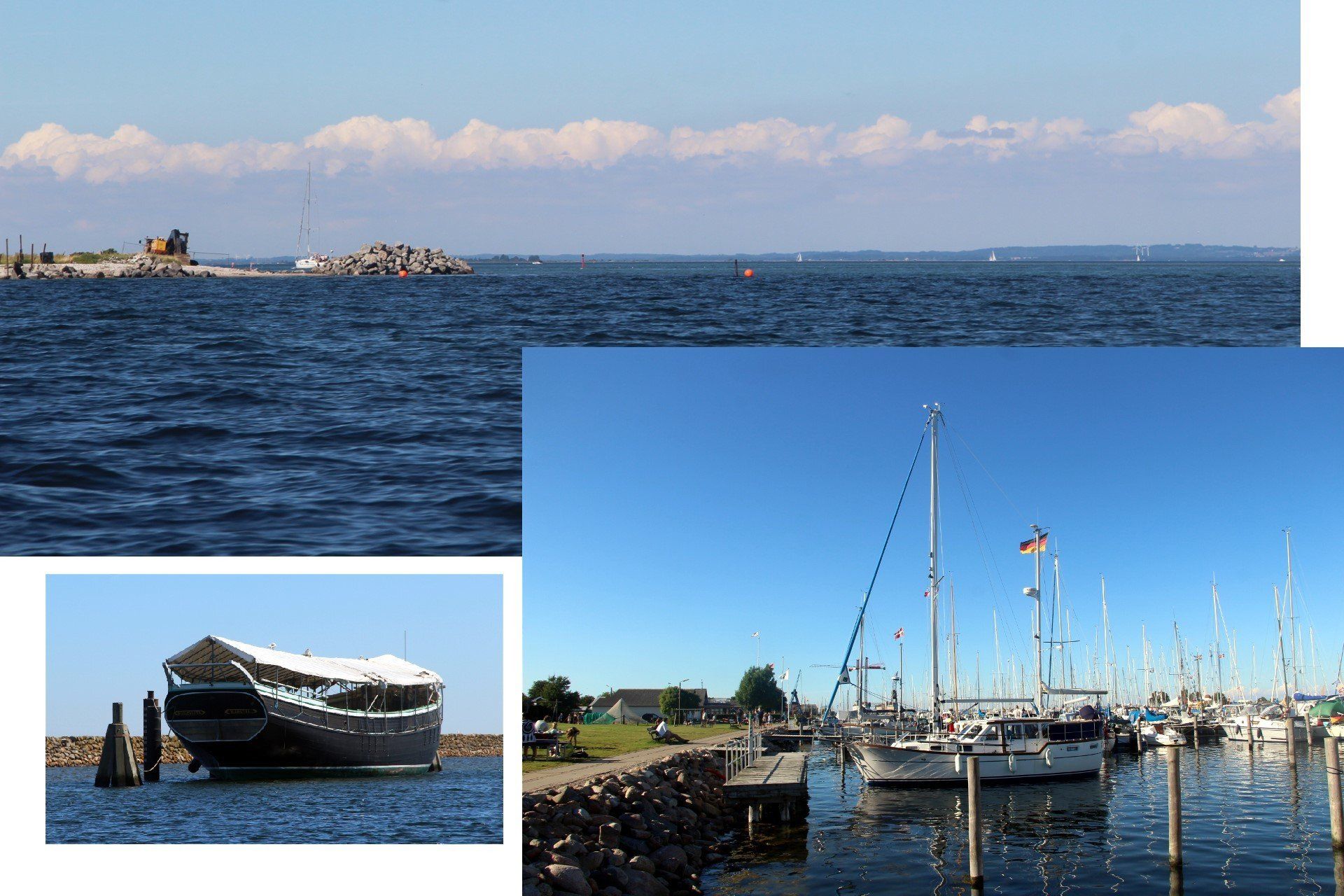 Wir steuern in den Hafen Gelting-Mole, müssen ja noch die geliehene Gastlandflagge zurückgeben. Hier sichern wir uns einen guten Platz und fahren wieder hinaus um den Rest des Tages auf dem Wasser zu chillen. Denn es ist sehr, sehr warm geworden. Auffallend viele kleine Quallen sind hier unterwegs.