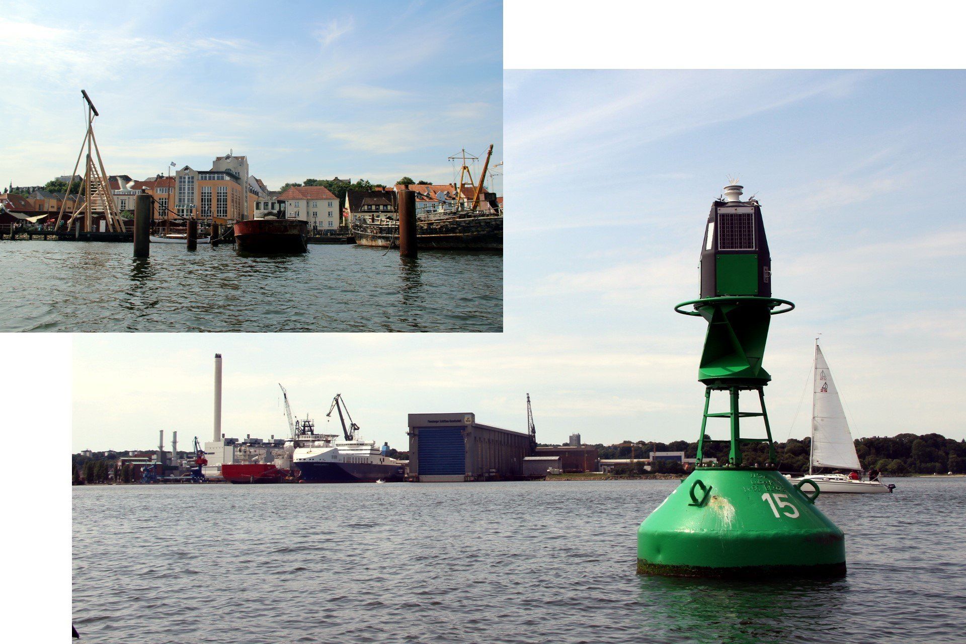 Das Wetter ist inzwischen endlich sommerlich und wirklich warm. Wir tuckern weiter in Richtung Flensburg-Stadt und bestaunen derweil die wirklich schönen Seiten der Flensburger Förde, die eine dänisch, die andere deutsch.