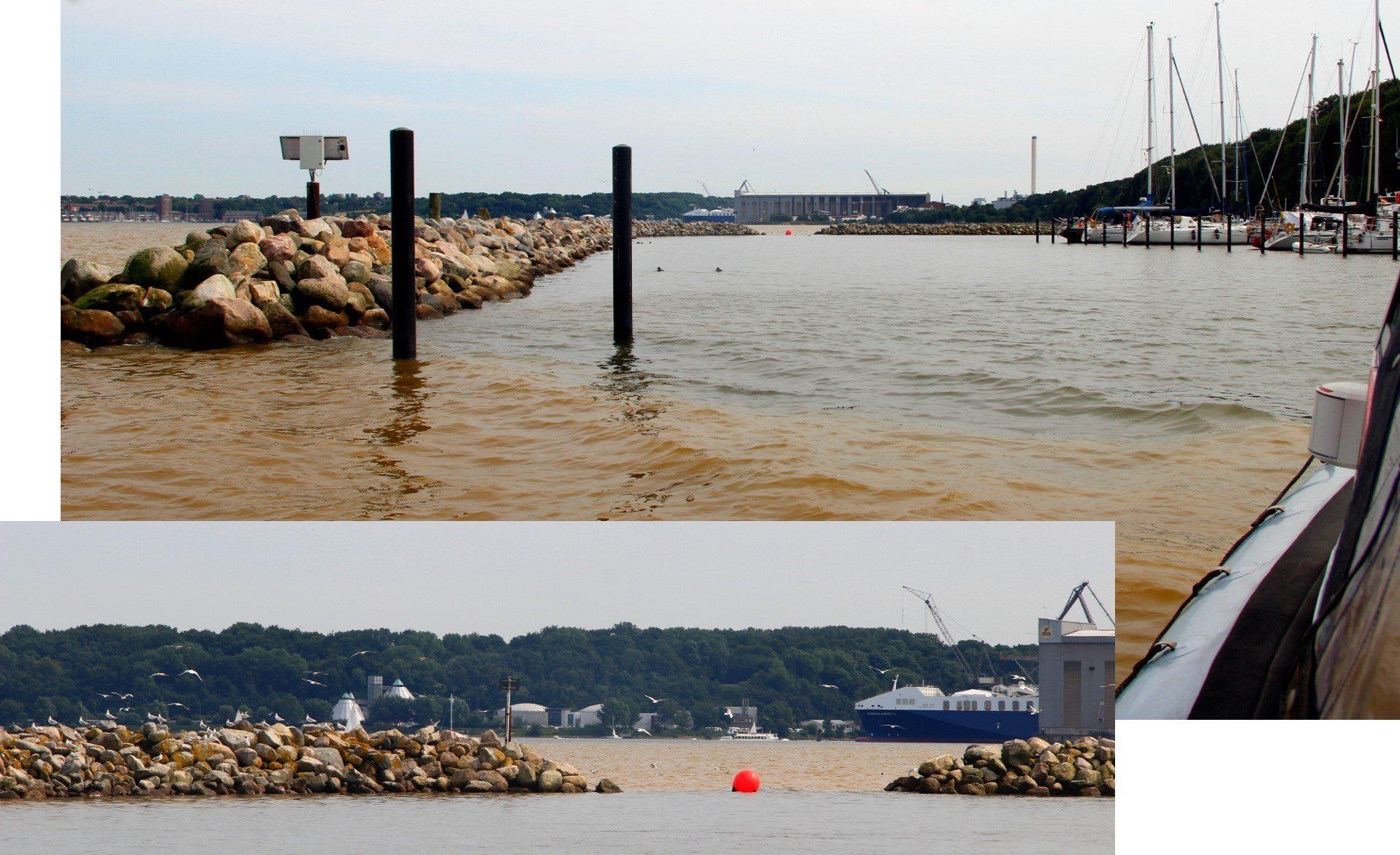 Am Ende der Förde fällt uns kackbraunes Wasser auf. Später stellt sich heraus, dass es sich um "Prorocentrum minimum" handelt. Okay, dass wussten wir natürlich nicht - aber es steht so in der Tageszeitung. Für alle, die es nicht wissen, es handelt sich dabei um die Zweigeißel-Alge, die das Wasser so färbt, vor allem wegen der Hitze.