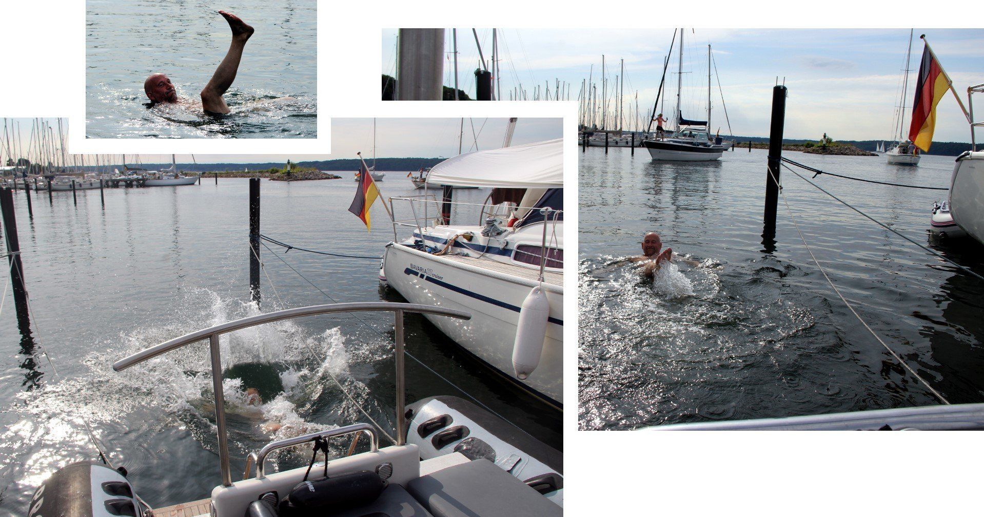 Zurück im Hafen Fahrensodde. Da es inzwischen endlich Sommer ist, wird auch die Badeplattform mal benutzt. Berti bei seinen Synchronschwimmer-Übungen. Ob das für Olympia reicht?