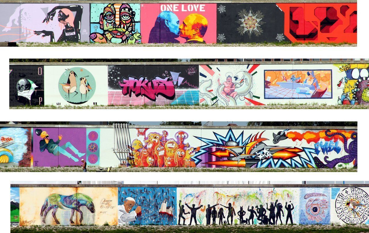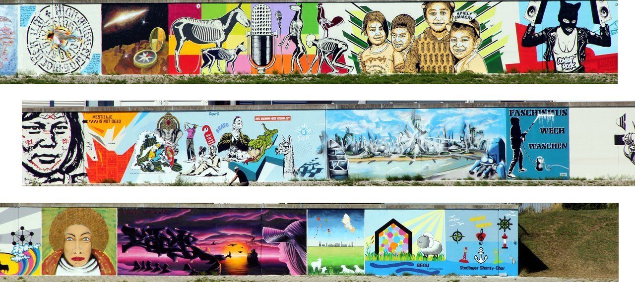 Die lange Mauer, an der wir vorbeifahren ist außergewöhnlich schön bemalt.