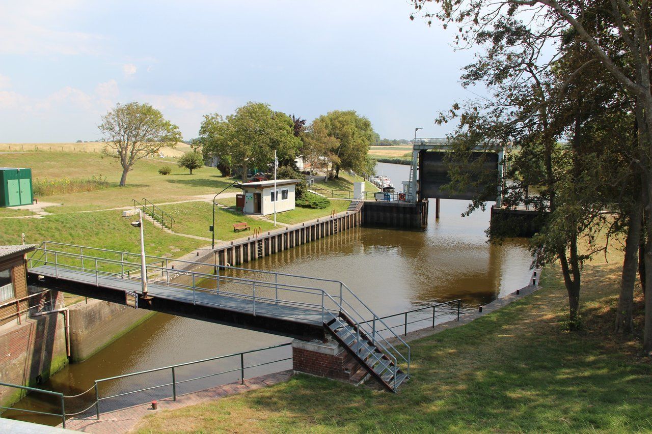 Wegen dieser Schleusendurchfahrt müssen wir paradoxerweise warten, bis genug Wasser abgelaufen ist, damit es mit der Durchfahrtshöhe passt. Aber haben wir dann auf der anderen Seite noch genug Tiefgang? Die nächste Sorge!