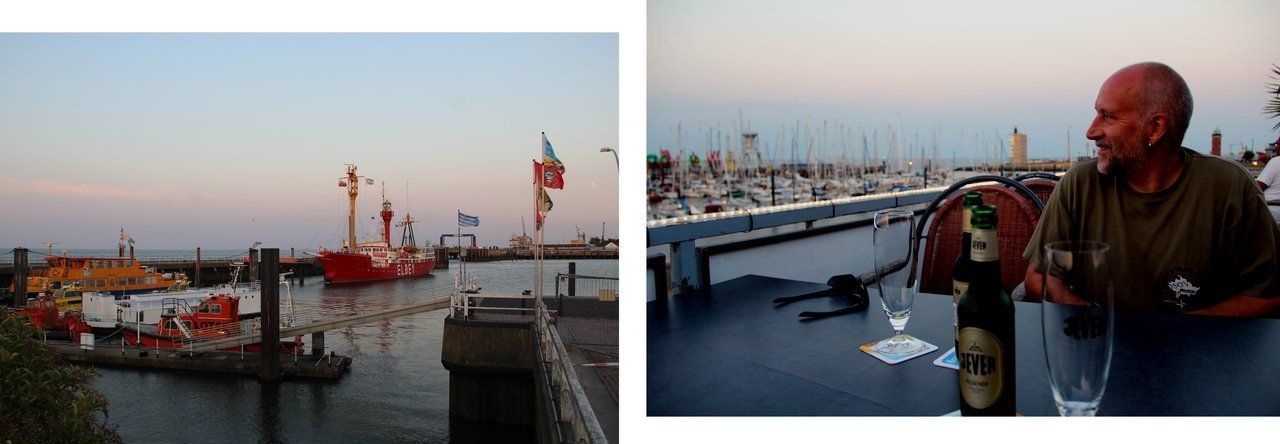 Zum Ende des Spaziergangs nehmen wir noch ein Jever auf der Dachterrasse im Hafen und genießen die Abendstimmung.