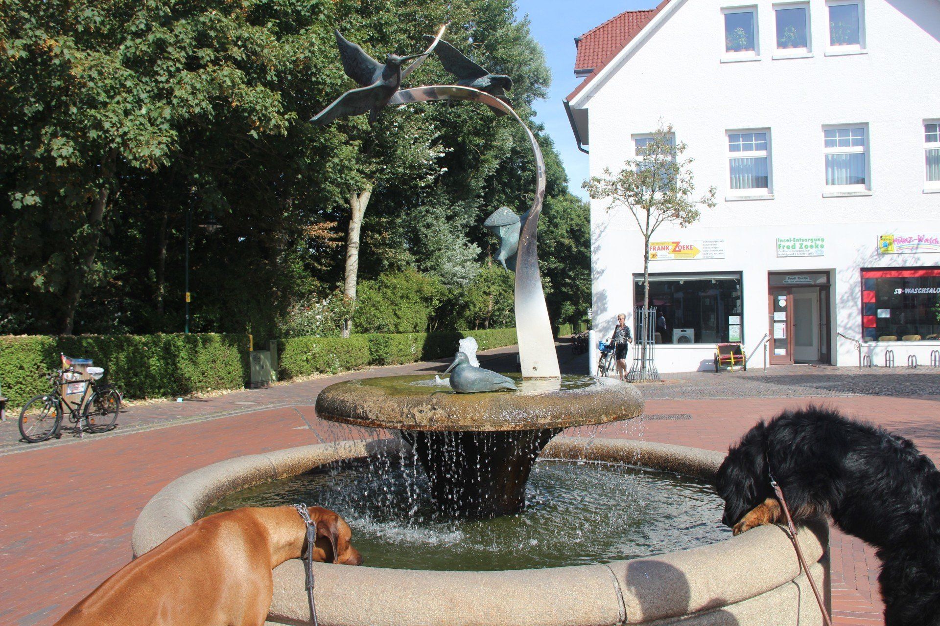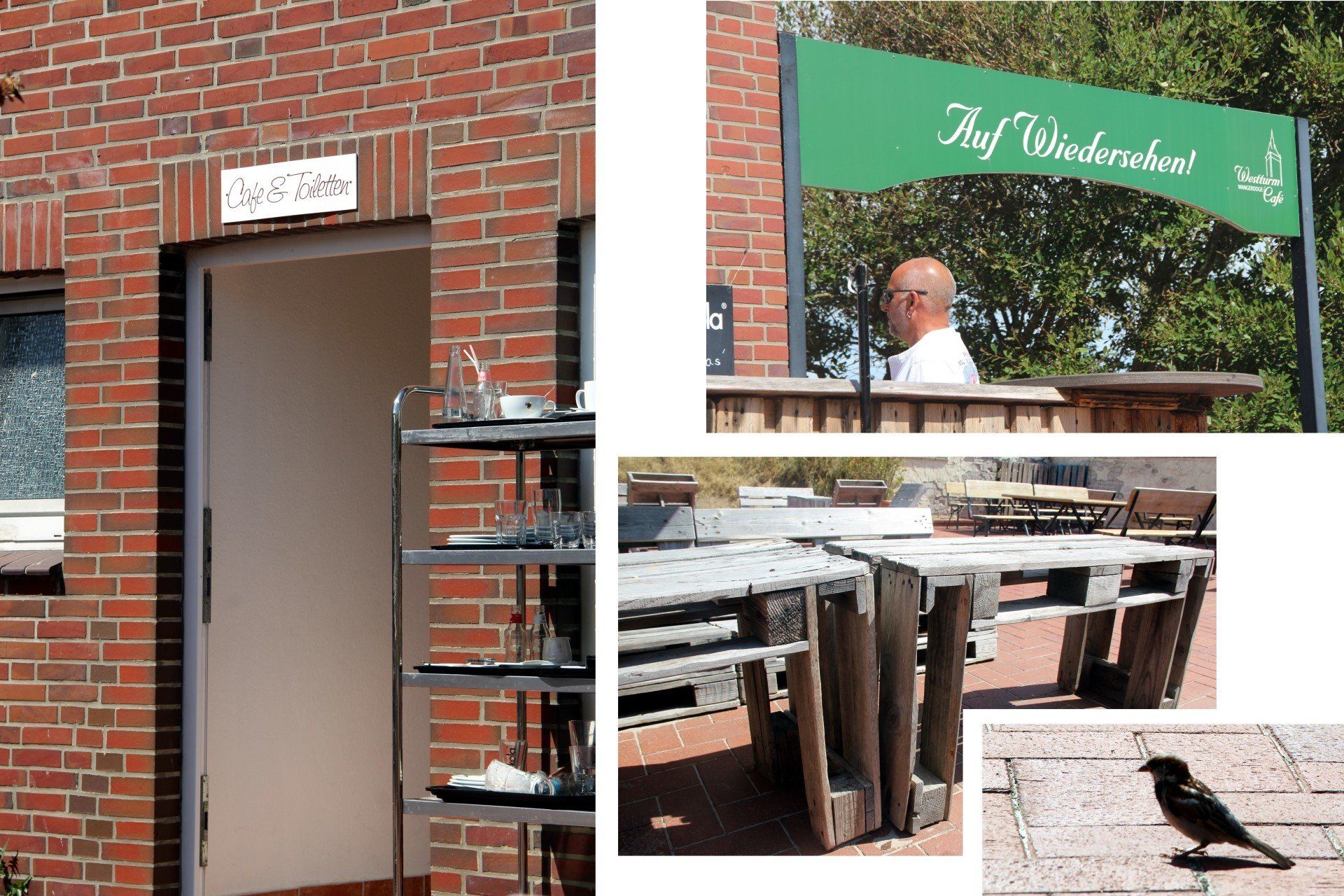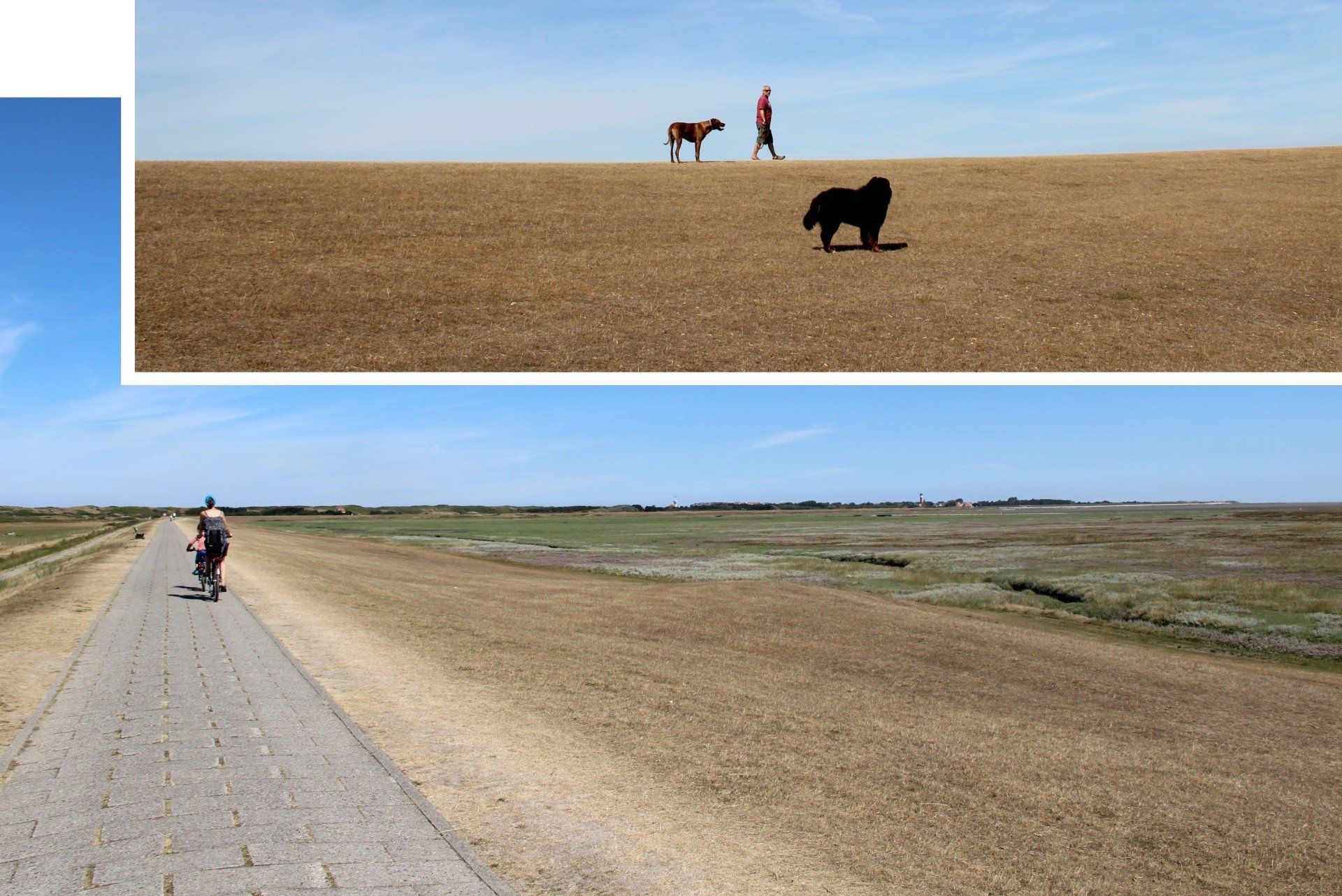 Die Bahn fährt recht früh die vom Festland kommenden Tagesgäste nach Dorf II. Dort gibt es den "Ölsardinenstrand" und Geschäfte zum Geld ausgeben für Nippes. Für uns aber zu früh. Die Hoffnung, dass etwas später noch eine Bahn fährt, verflimmert in der Morgenhitze. Also noch mal per Pedes am Deich entlang. Ein wirklich heißes Unterfangen. 5 Kilometer später legt Timsen sich erst einmal in den Dorfbrunnen.