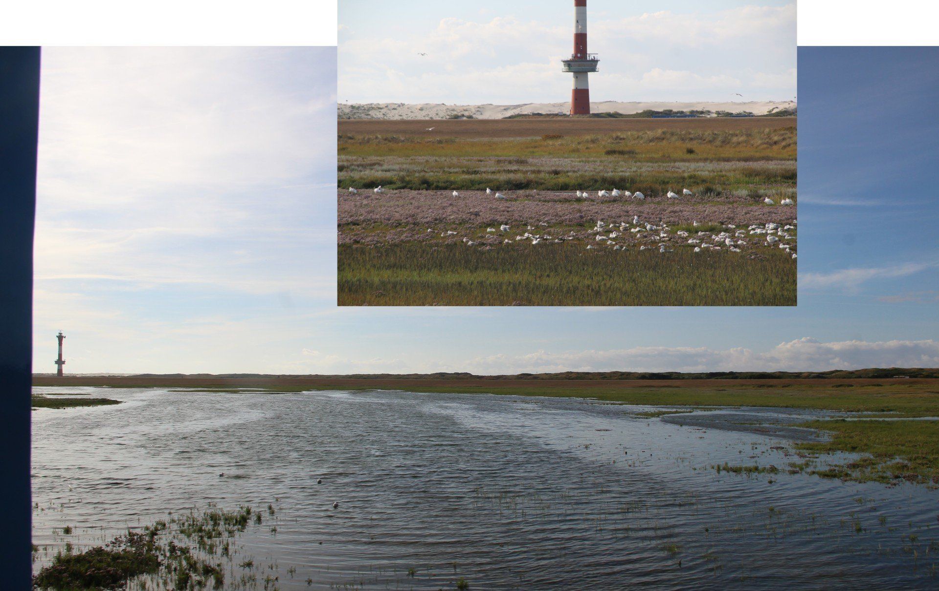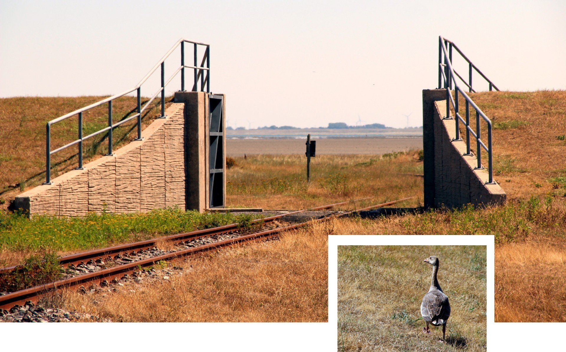 Die Fahrt geht über 5 Kilometer durch Salzwiesen und an kleinen Brücken vorbei am Wattrand entlang.