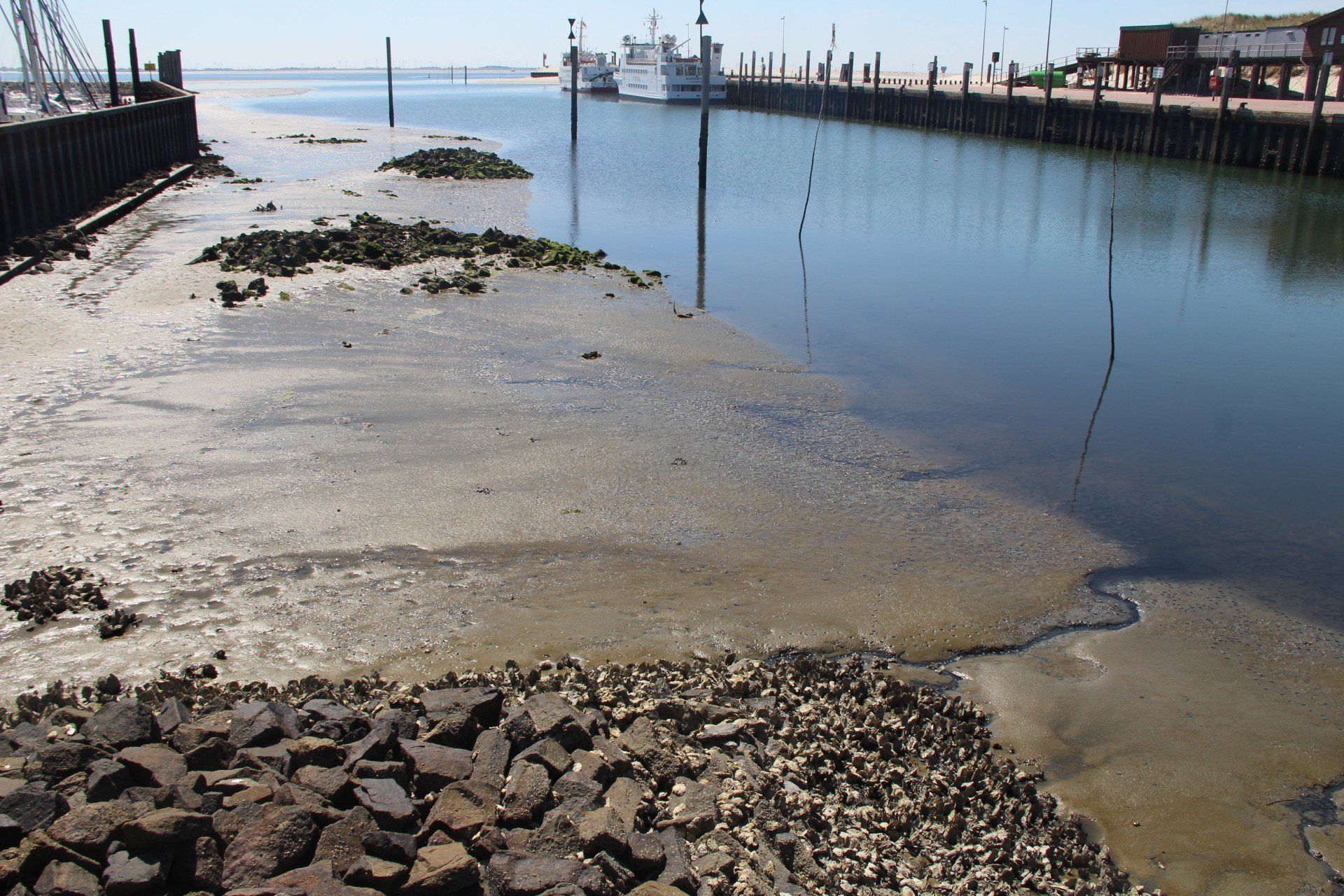 Wir haben einen tollen Liegeplatz gefunden mit direkter Sicht auf die Hafeneinfahrt. Alle Schiffsbewegungen können wir beobachten und außerdem die Veränderungen durch Ebbe und Flut.