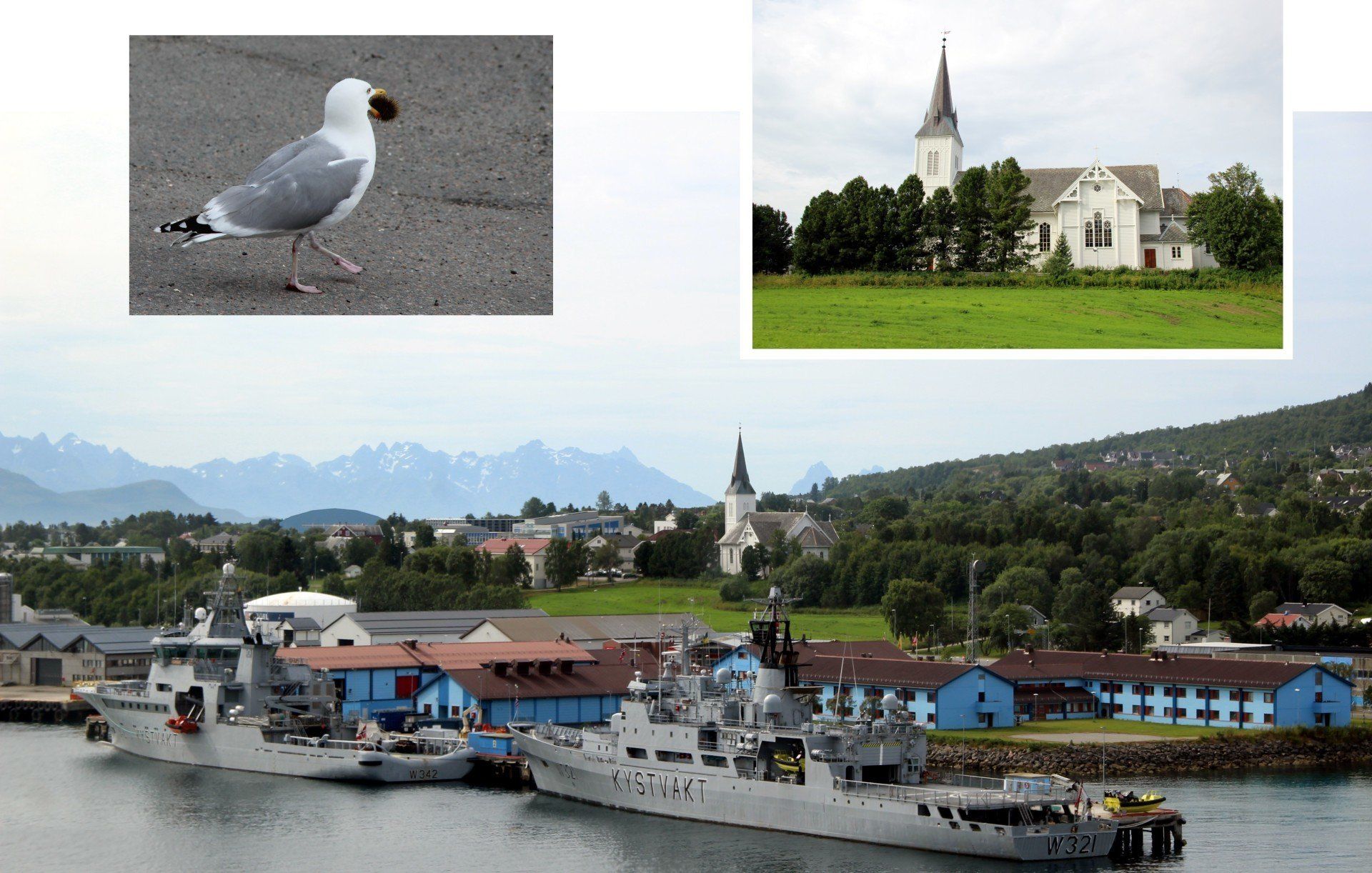 Sortland, eine Stadt auf der Insel Langøya. Hauptstützpunkt der Küstenwache. Imposante Schiffe liegen hier.
