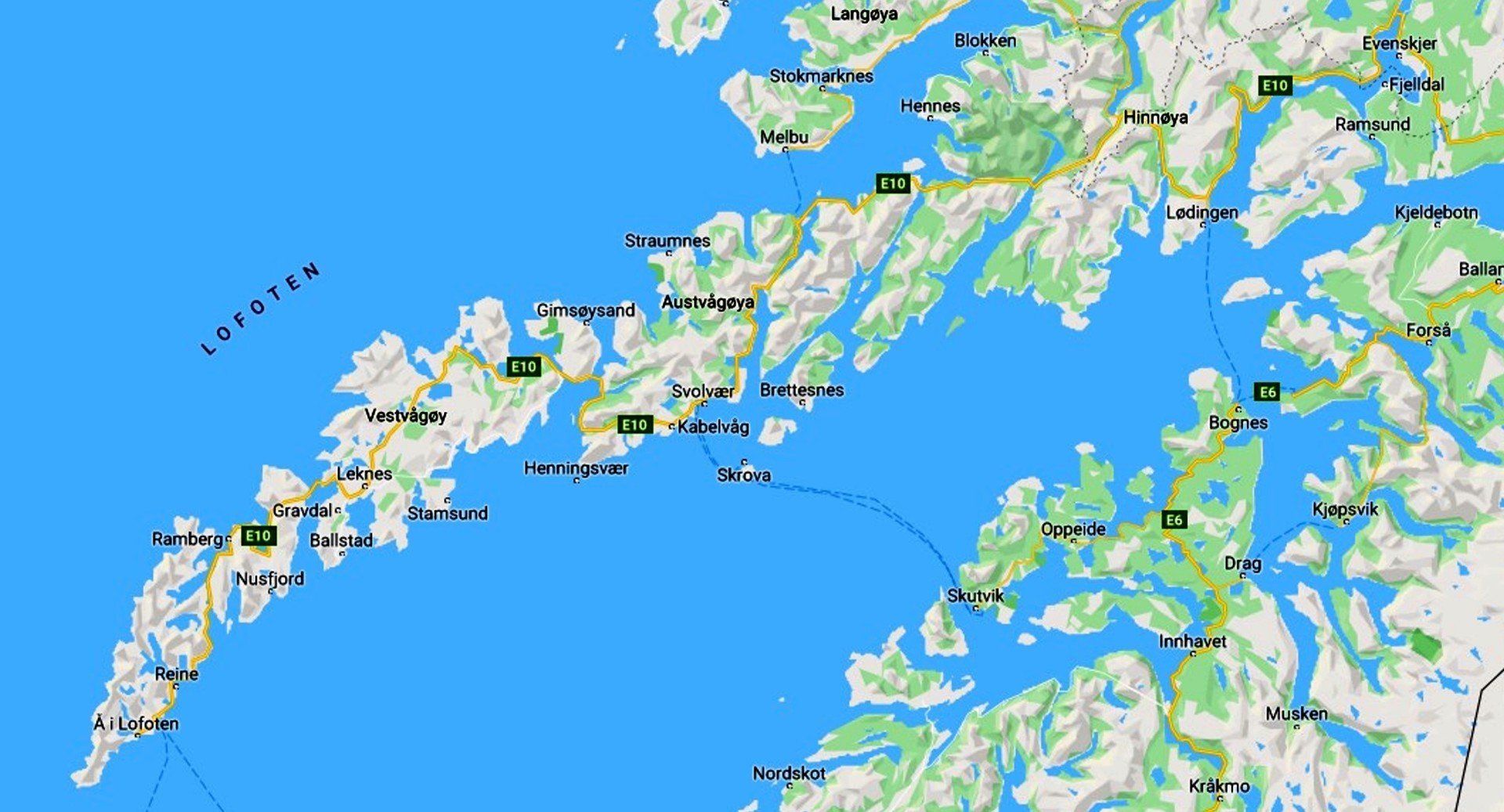 Die Inselgruppe der Vesterålen wollen wir heute gegen die Lofoten tauschen. Die Vesterålen hatten alles zu bieten, kultivierte Flächen entlang der Küste, hochalpine Alpenlandschaft, Flüsse, Seen, schroffe Küsten mit Buchten, weißen Sandstränden, Fjorden und Schären.