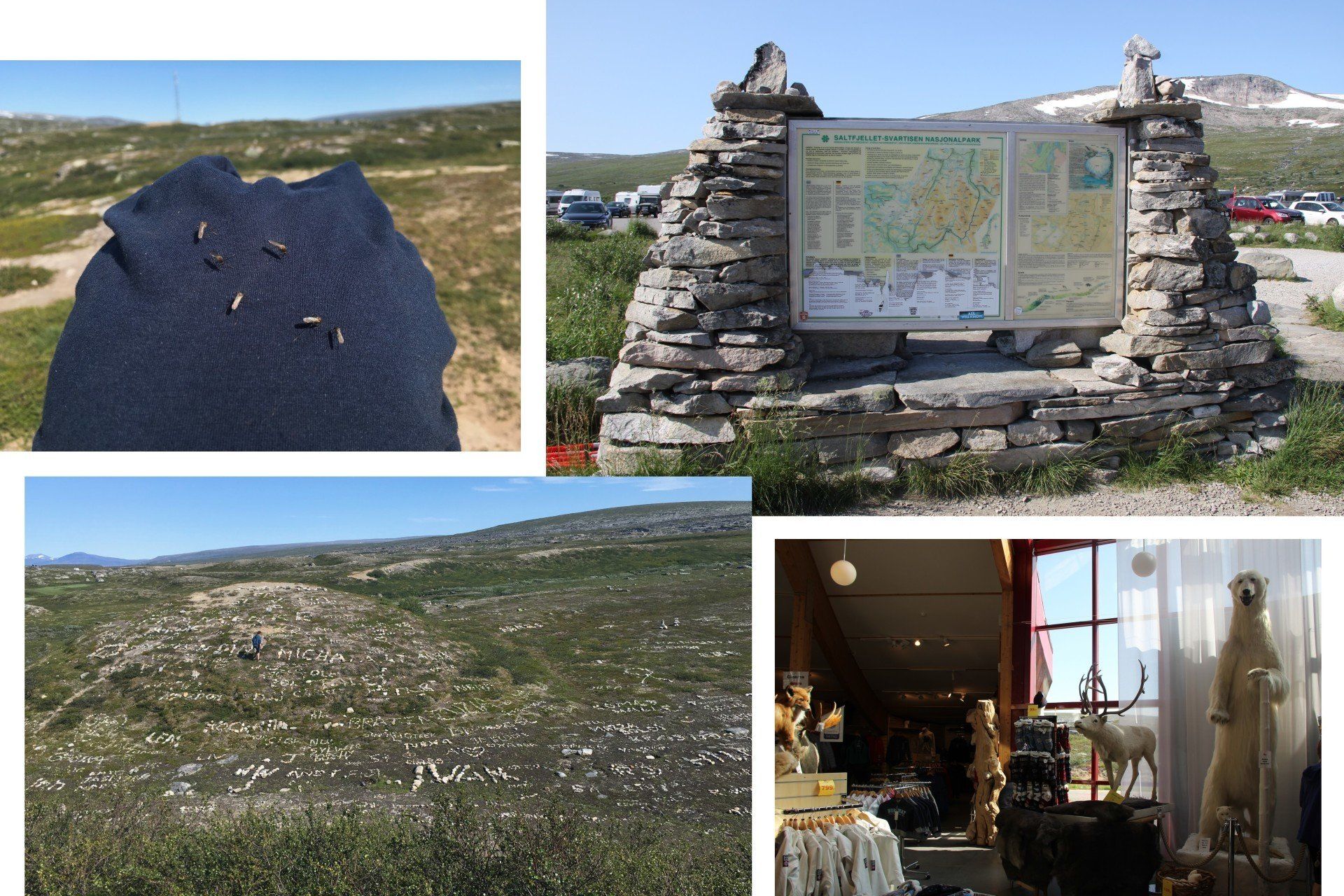 Mücken attackieren uns. Gut, dass wir adäquat bekleidet sind! Viele Touristen haben mit Steinen ihren Namen in die Landschaft geschrieben.