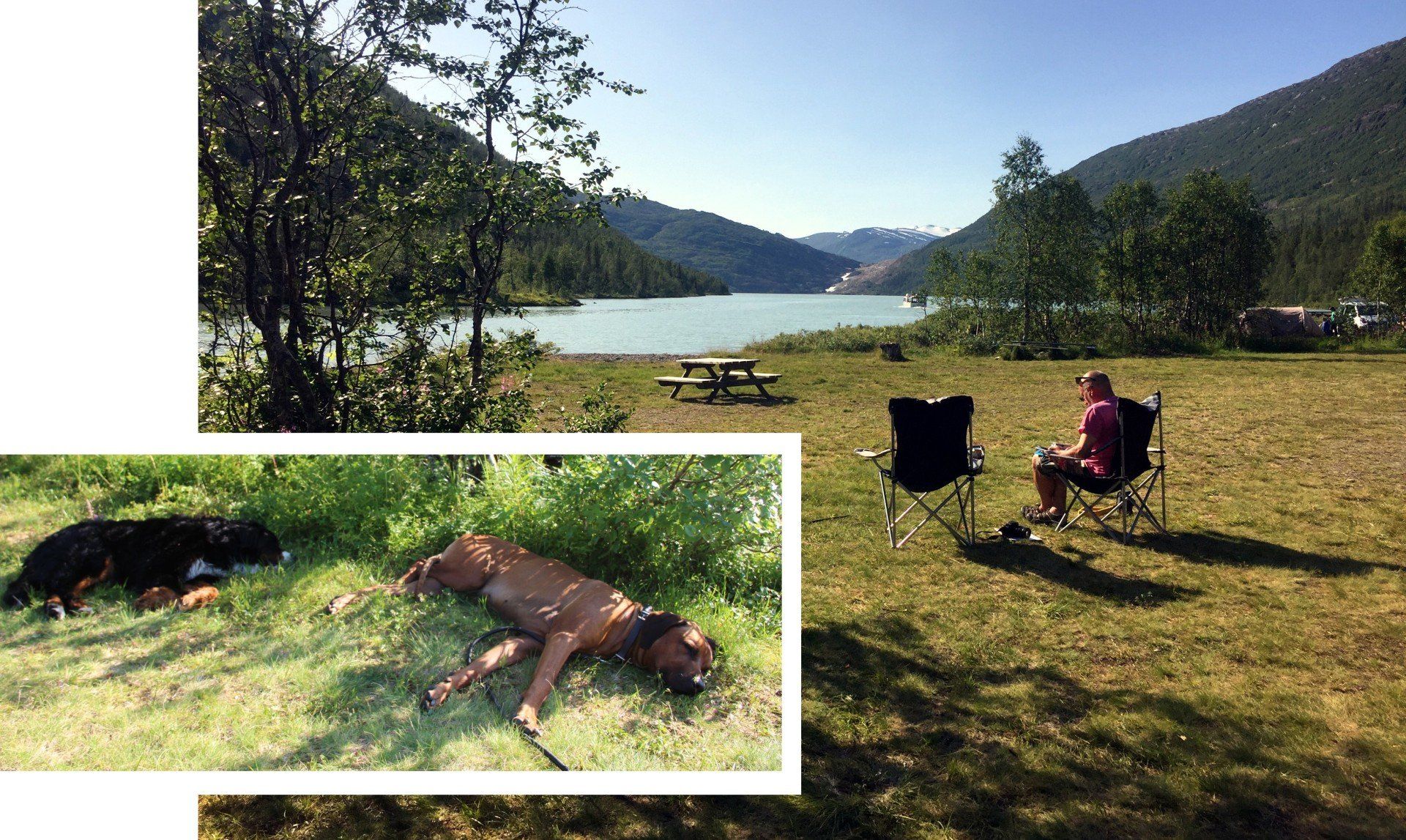 Am Fluss Namsen legen wir auf einem schönen kleinen Picknickplatz einen weiteren Halt ein. Mit den Hunden spazieren wir einen kleinen Wanderweg den Fluss entlang bis zu den Stromschnellen Sandåmofossan. Hier in Norwegen scheint alles unkomplizierter zu sein. Man tut einfach alles in Eigenverantwortung und das funktioniert.