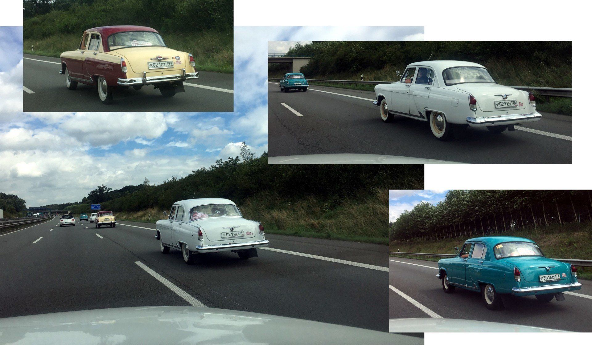 Unterwegs überholen wir eine Kolonne allerfeinst restaurierter Wolgas. Das man die noch mal wiedersieht! In der DDR wurden sie oft als Taxis gefahren.