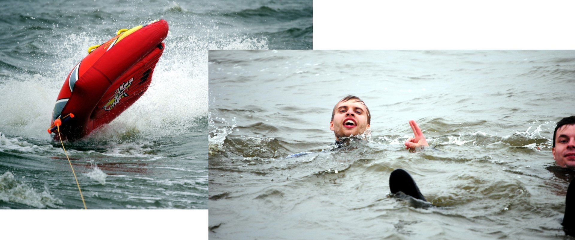 So gaaaanz lange geht das nicht gut. Dann katapultiert es die Beiden vom Tube. Gut dass wir Neoprenanzüge mitgenommen haben. Das Wasser hat noch empfindliche 17 Grad. Trotzdem klettern sie noch ein paar mal wieder hinauf und haben einen Heidenspaß!