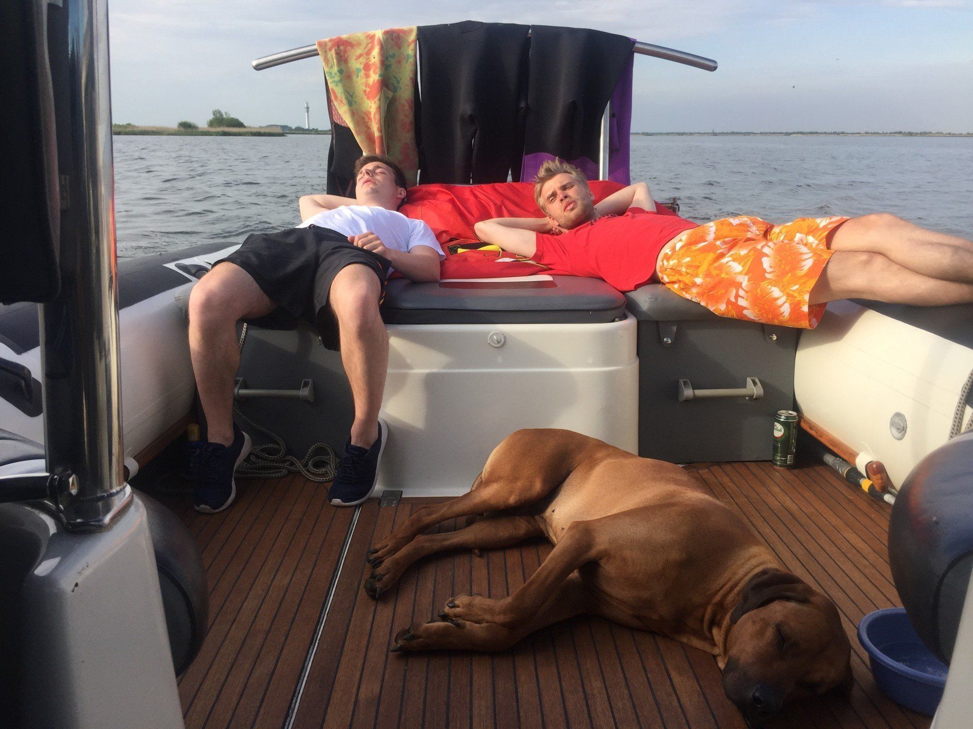 Aber erst einmal laufen die Vorbereitungen. Es gibt einen Arbeitstag in der Halle; das Boot wird hergerichtet, es ist einiges zu tun! Selbstverständlich wird in diesem Zusammenhang überprüft, ob die Kühlung an Bord noch funktioniert! Und ein Tube wird gekauft, wir wollen damit auf dem Ijsselmeer fahren. Aber nach der Lieferung probieren Cupper und Timsen es erst einmal als Trockenübung im Wohnzimmer aus.